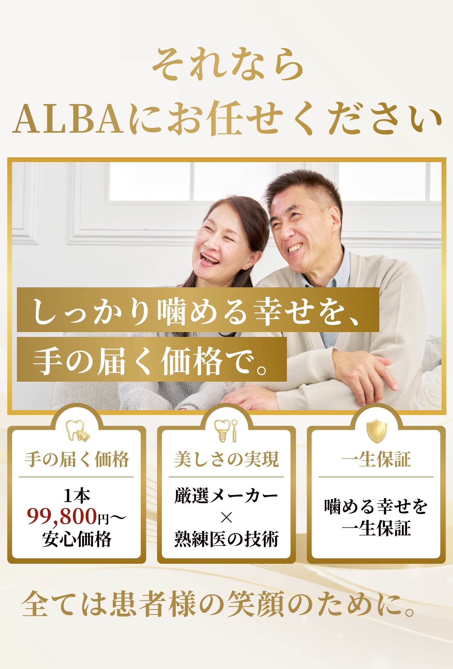 「できるだけ多くの方に、もう一度“しっかり噛める喜び”を取り戻してほしい」その強い想いから、採算度外視の低価格である99,800円という料金を実現。